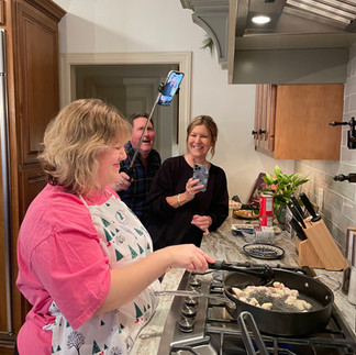 Once the oil is to temp, carefully fry the chicken, working in batches, for approximately 4 minutes, making sure to occasionally move it around the pan so that all sides of the chicken can cook and it doesn't stick to the bottom. Working in batches insures an even fry and that the oil temperature does not drop.